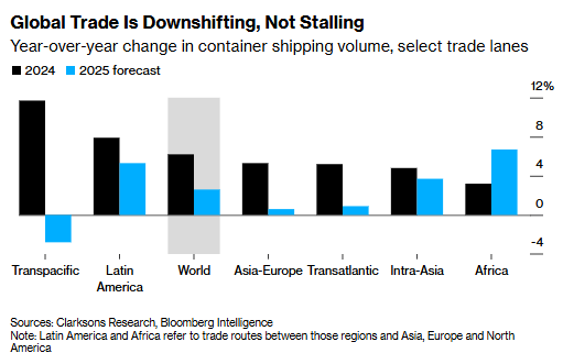目前,全球商品流向的变化尚未引发“地震级”动荡,更多是细微调整,但这些变化已开始在数据中显现。8月,中国出口增速降至六个月来最低,其中对美出口暴跌33%;与之形成对比的是,当月中国对东盟十国出口增长近23%,对欧盟出口增长10%,对非洲出口增长26%。这些数据表明,作为全球第二大经济体,中国今年仍有望实现1.2万亿美元的创纪录贸易顺差。